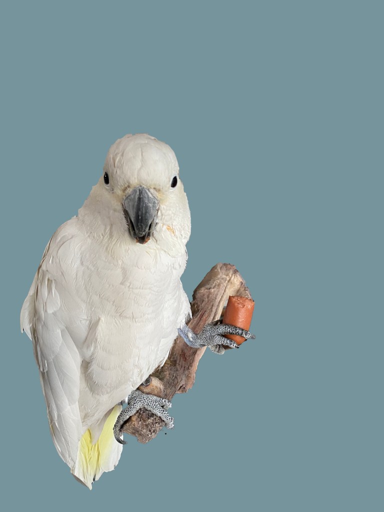 After removing the in-home background, I could see challenges in finding a suitable background for Peaches, his perch, and the hot dog. A temporary solution was to place them against a solid color background.
