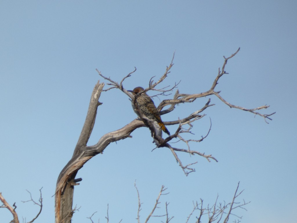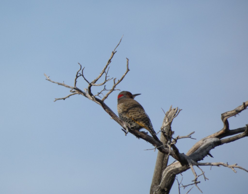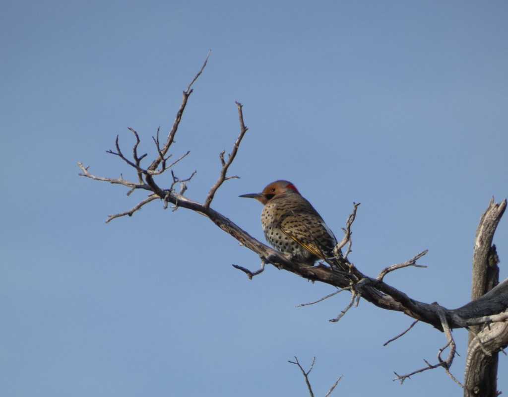 In wintery frigid weather, wild birds aren’t easily spotted. This one wasn’t in a hurry to fly away and I paused peering into the distance, deciding it really was a bird, but one I couldn’t identify offhand. It had mottled colors and a long beak suggesting a woodpecker type.