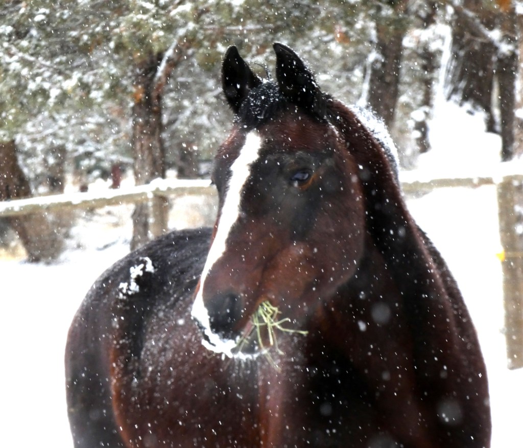 Here’s my lead mare, Rosie, during one of our recent snows. She is Sunni’s older (full) sister and guards a trio which includes Pimmy Donkey. This image is a good one for posting later to the Facebook world.