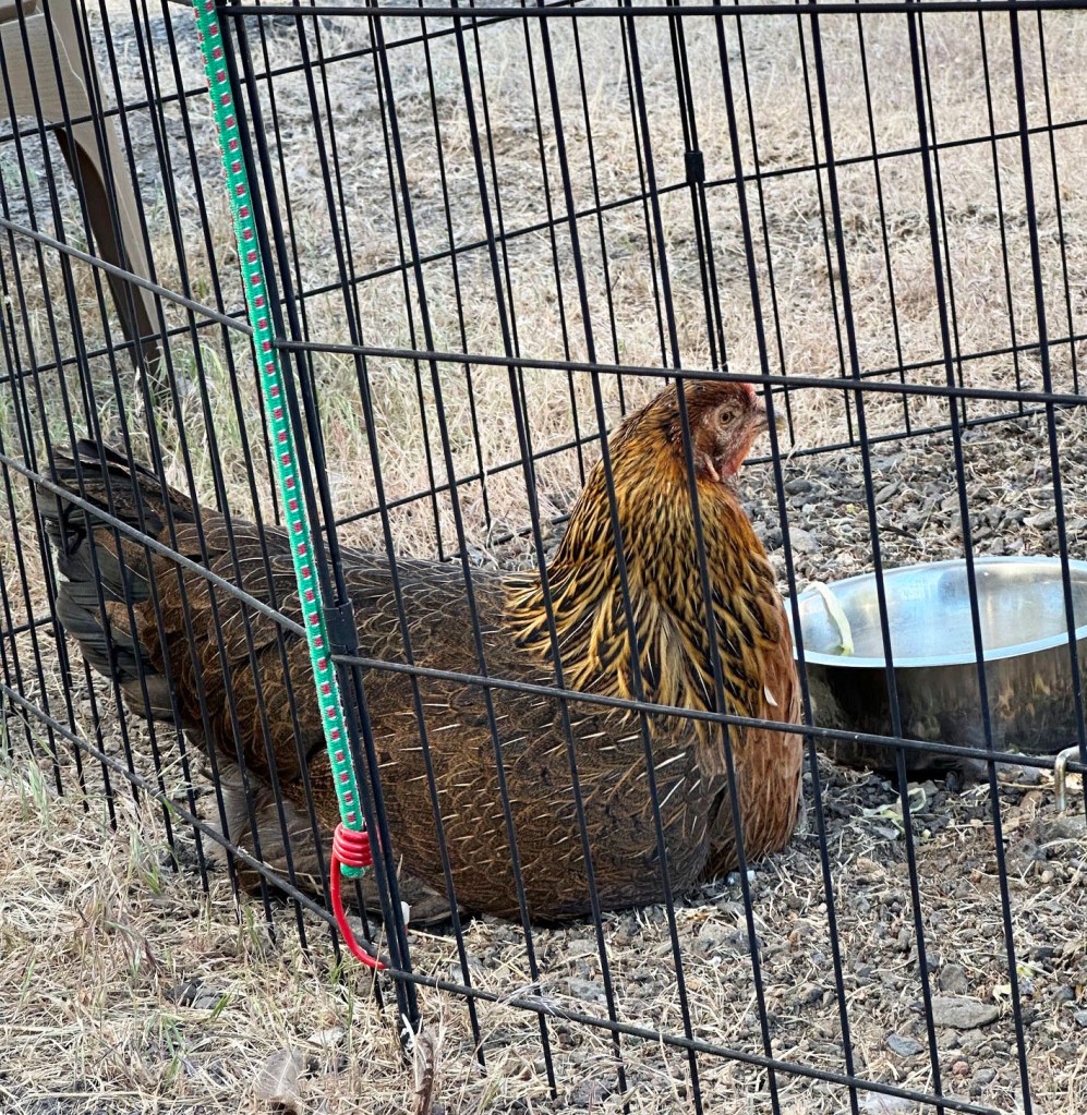 That’s my house-hen, “Wellsummer.” She’s thirteen-years-old, and outside enjoying the nice weather. This last surviving hen from my first flock continues doing well and, although eating less, keeps good weight and spirit.