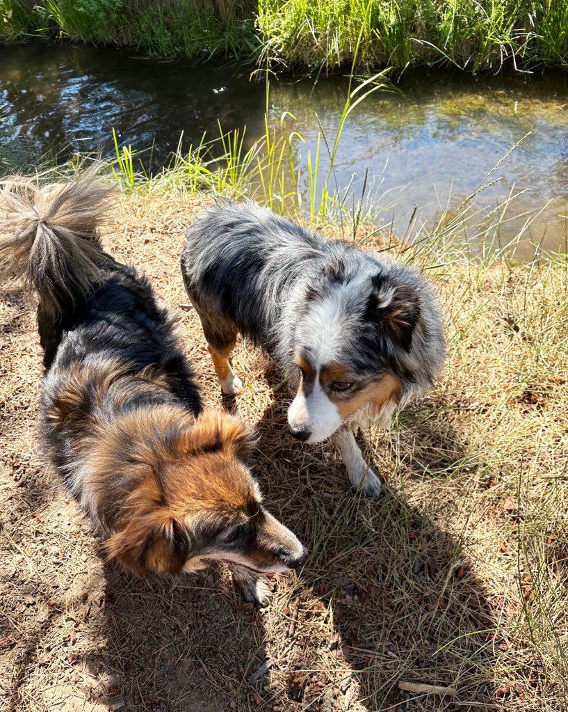 The header photo captures new buddies, Ryder and Chase, in a canal doing one of their many wallows. Ryder’s person, Rochelle, is a long-time friend, and we were hiking with the pack.