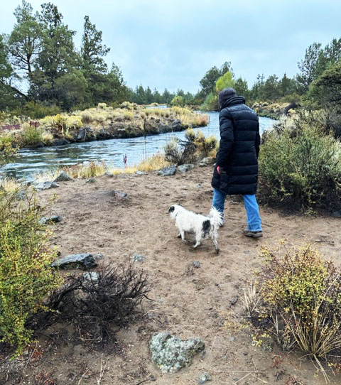 Here’s a nice capture and almost a mood piece. Little Mitzvah and I are going to the canal. I wanted to support Mitzvah, as she refuses to enter a body of water, but will tiptoe to its edge, drink, and let her paws get wet.
