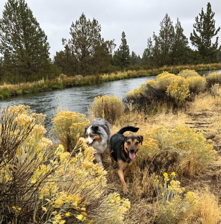 Yesterday, rain throughout our hike kept us all damp. Nonetheless, our water-loving dogs couldn’t get wet enough. This fun capture has Rachelle’s Ryder and my Chase emerging happily from their umpteenth full-body dip.