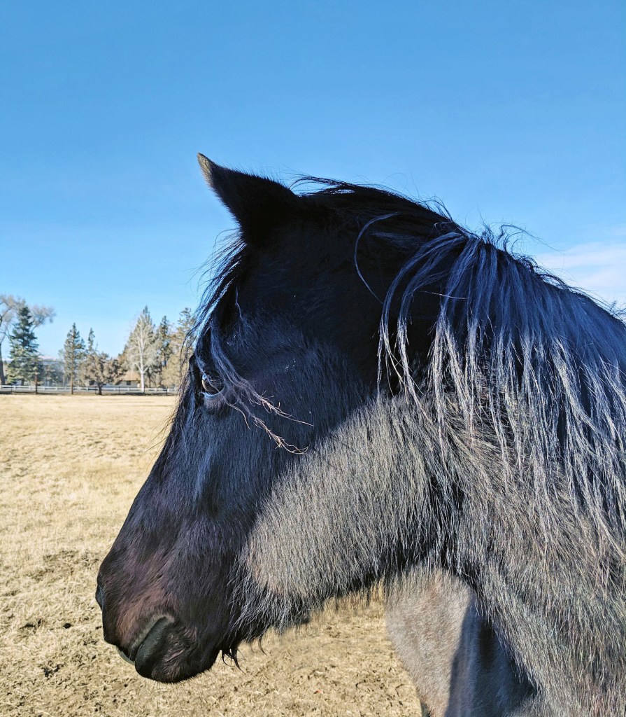 Here’s a capture of my very winterized, wooly pony, Sunni. She seems disinterested in me and my camera, but has a busy eyeball!