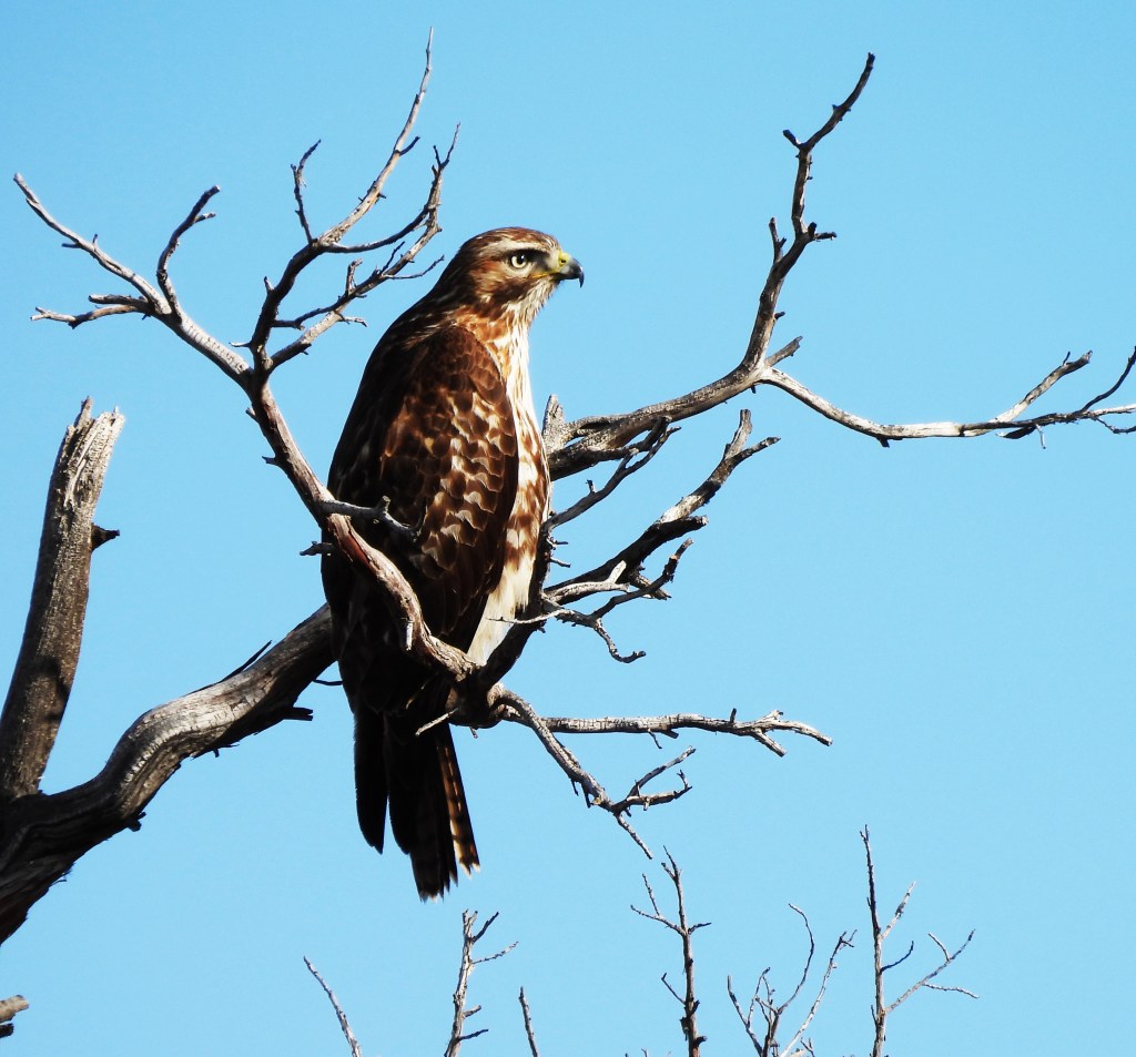I spotted this raptor perched again yesterday morning atop my neighbor’s dead tree. Maybe a Red-Tailed Hawk, that’s my first guess because an active pair regularly hunts in this area. Doubtful, however, as this bird appears to work alone.