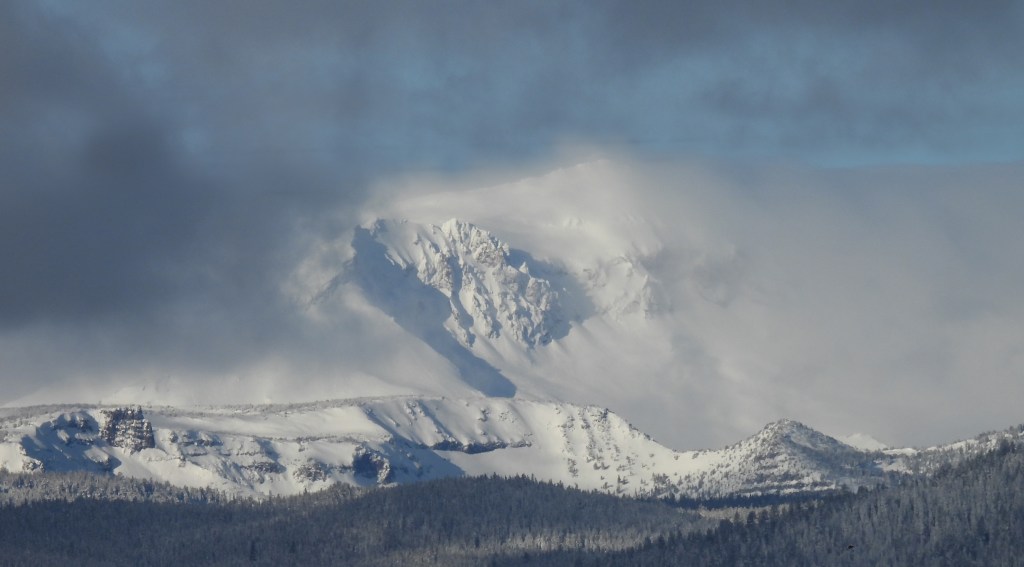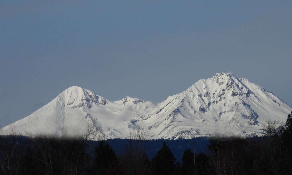 Around now, each February, I’m eager to see pauses in the dim and snowy atmosphere. I want clear sights of the Cascades peaks. Last week, one day was perfect for capturing the Middle and North Sisters. In the header photo, they’re snow-covered and gorgeously vivid.