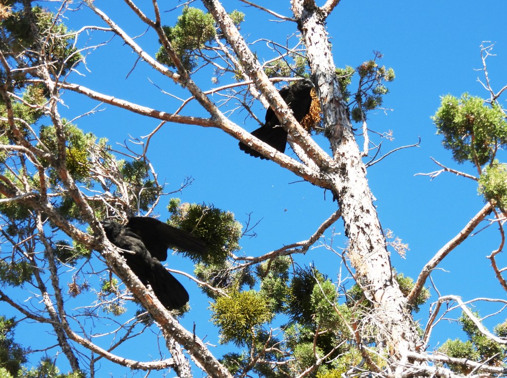 This is a fun, distant capture. I love Ravens, especially the family that annually nests nearby. My favorite spottings are of the parents training their fledglings. It’s impossible to miss Raven activities; the birds are as noisy as they are large. Here, the babies, instructed to park, are awaiting the return of their parents; they’re making lots of noise.