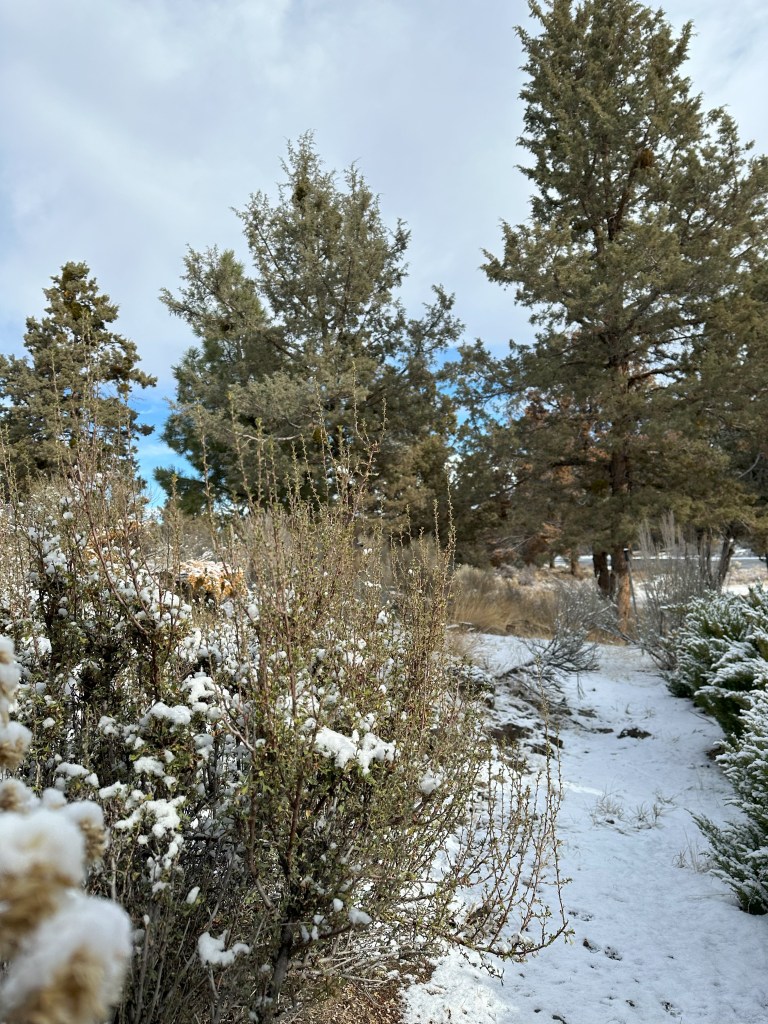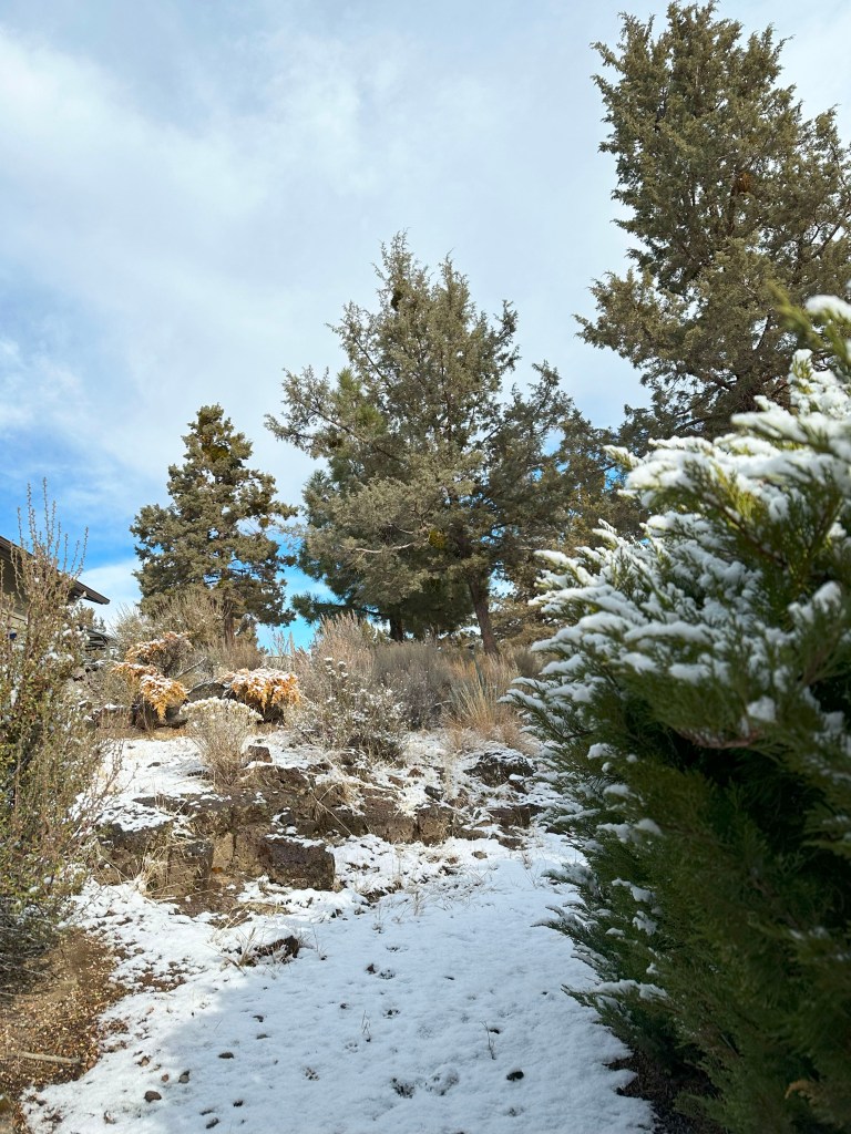 In the afternoon, snow sightings captured my attention and distracted me from task mode. I was charmed by fresh white toppings on still-green plants and walkways and turned to photography.
