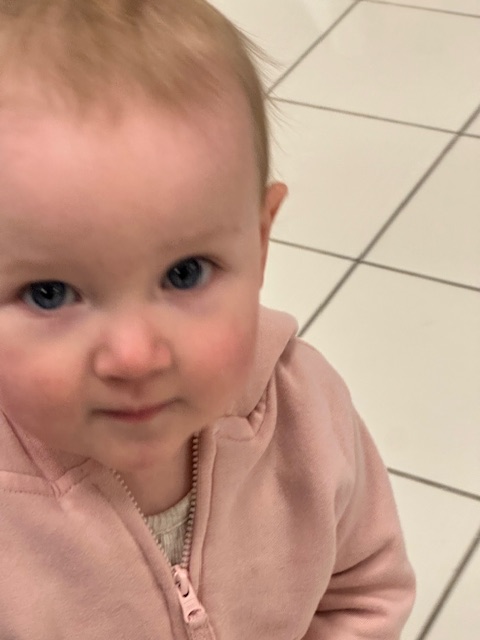 I saw one-year-old cute and all-adorable Louella hurrying on awkward little legs through the department store aisles where I work part-time. The lil’ runner’s mom was trying to keep up with her and said I could take a photo. Just then, Louella–all smiles–turned and hurried toward me, reaching for my phone. That’s today’s header photo moment.