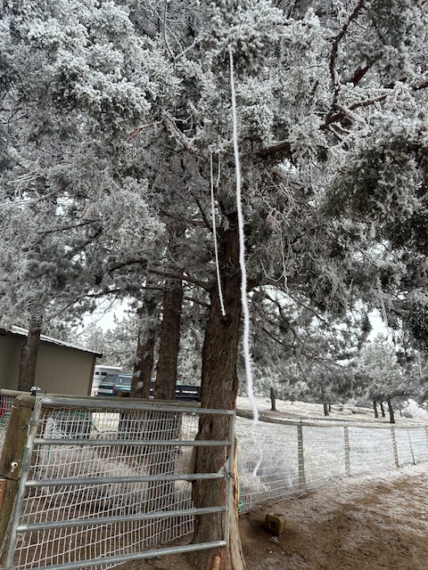 You’ll never guess what I discovered. The “rope” I was trying to hold was a single hair from one of my horses’ tails. Looking up again, I noticed several similar strands—long, pale, impossibly fine—each thickened by frost and hanging, rope-like, from the branches.