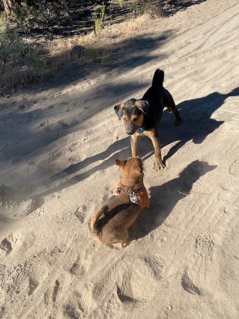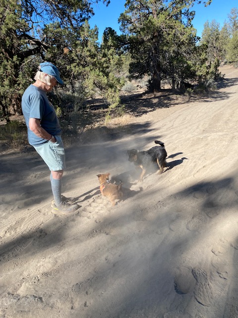 Central Oregon’s accessible irrigation canals also are cooling spots for humans and dogs. Flowing water maintains surrounding trees, grass, and shade in otherwise hot sandy areas. While hiking with my dogs, I may tote a lightweight folding seat. If a pretty spot makes me feel like pausing, I will take the time to observe satisfying water tripping over rocks in Lilly-lined channels. My pups play, drink, and swim.