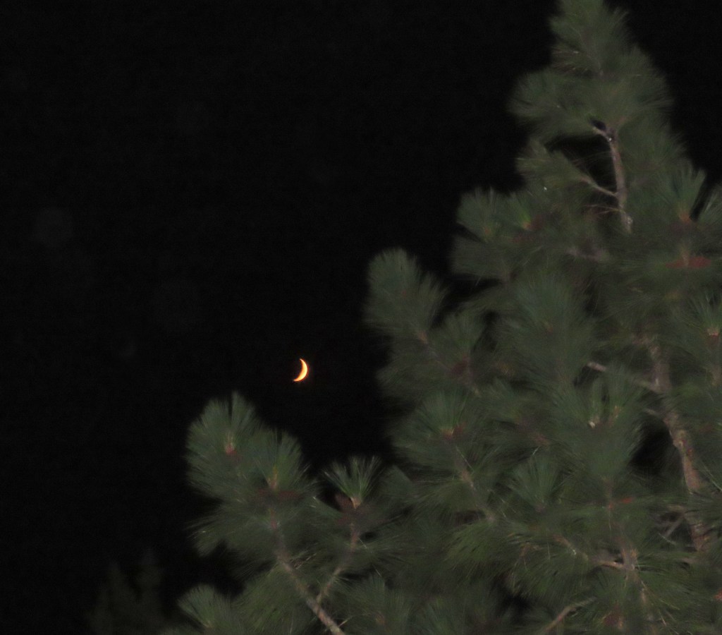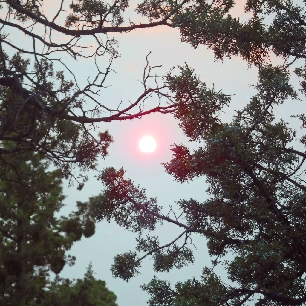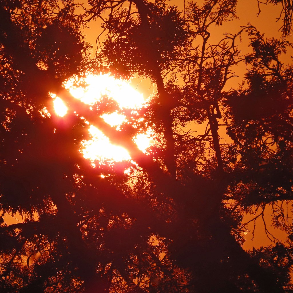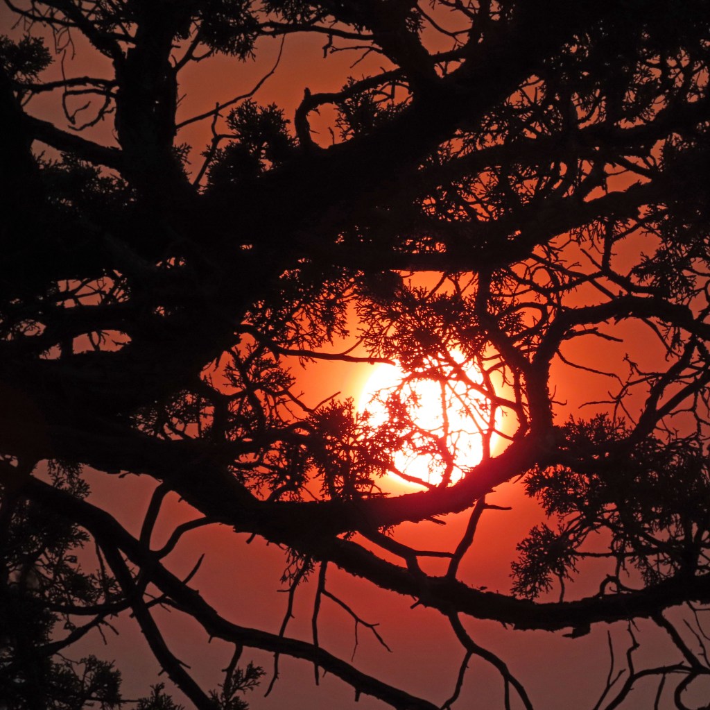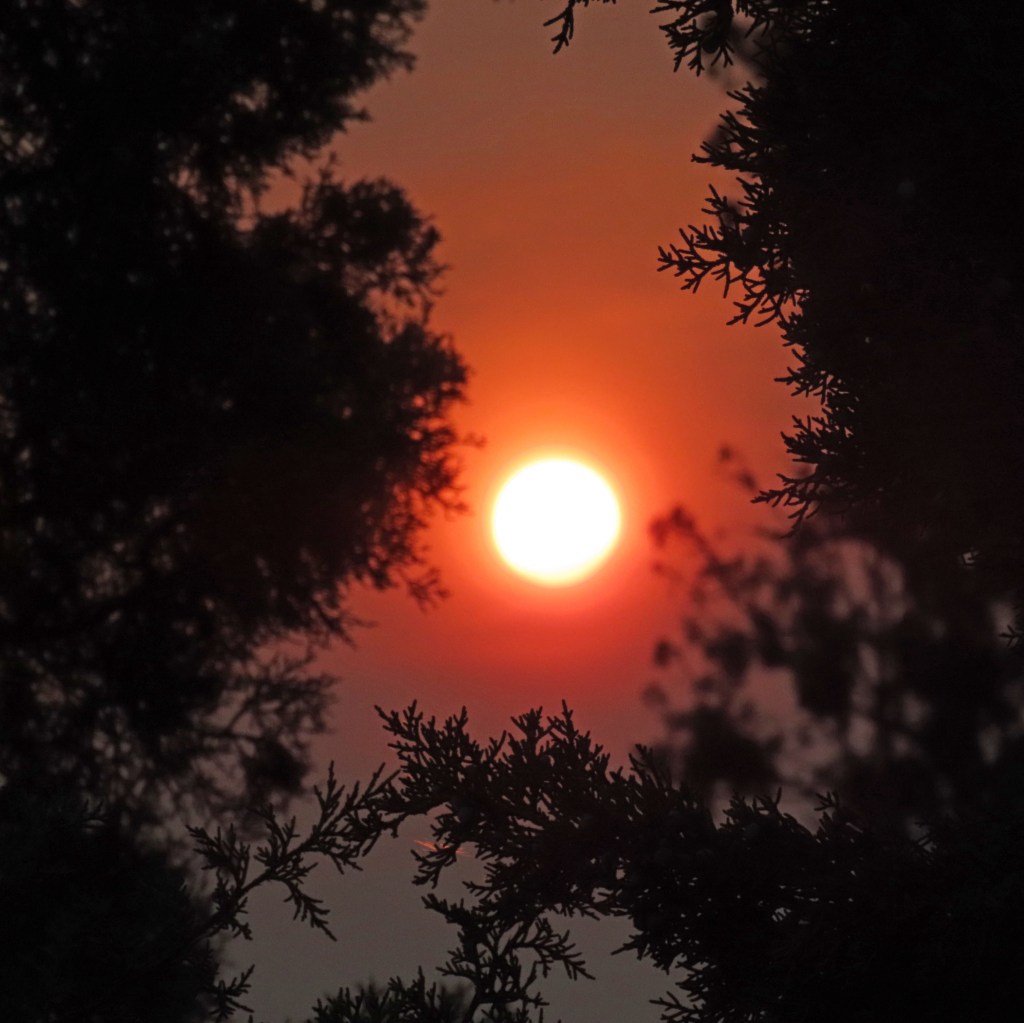 The redness in this image is nothing close to a real-time view of the sun late yesterday. Then, the ball itself was perfectly-round and very bright red, made stunning by smoking from massive wildfires. My camera couldn’t pick up the sun’s brilliant color, but it captured some atmospheric reflections.