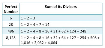 A number is perfect if all of its factors, including 1, but excluding itself, perfectly add up to the same number a person begins with. For example, the number six is perfect, because its factors, 3, 2, and 1, all sum up to 6. Another example, is the number twenty-eight, also perfect, because 14, 7, 4, 2, and 1, add up to 28.