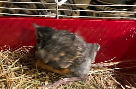 During week one, the rescued baby Robin lived in my garage, housed in a cage, received food often.