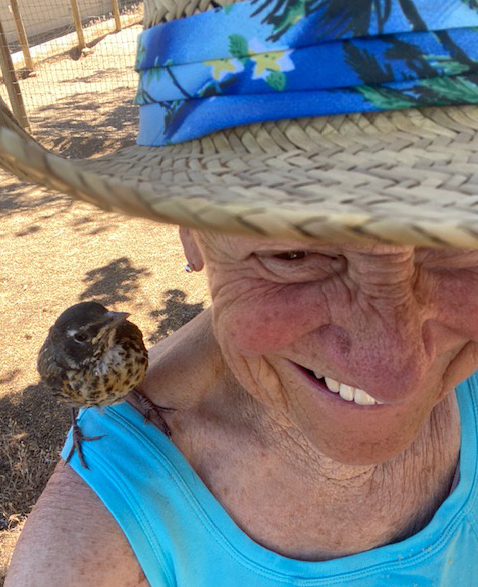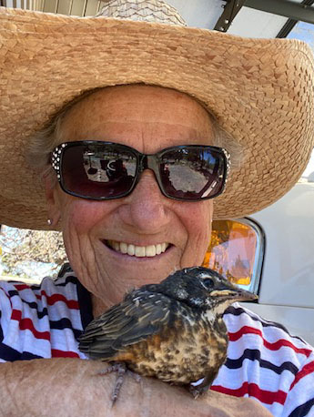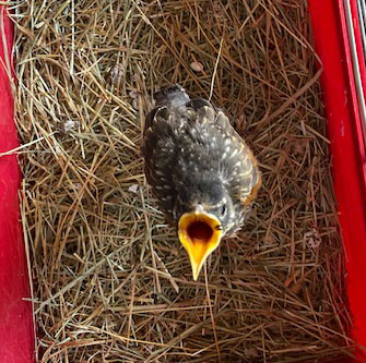 Every few hours the Robin and I communicate. I walk around saying softly, “Bird?”, and after waiting, maybe again then, “Bird, Bird?” Almost instantly I pick baby’s sounds from those of resident Robins. In another moment Bird flies to me wanting a meal.