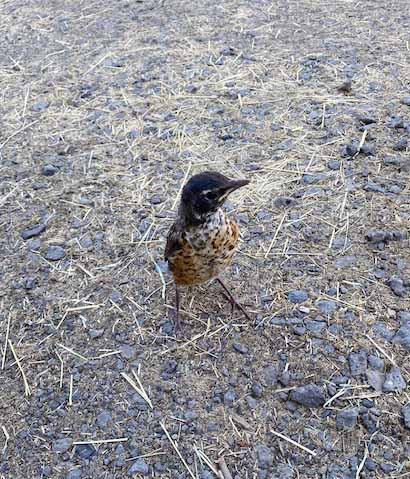 Bird is growing, still has baby spots over its reddish breast. Changes occur rapidly and hours make a difference. Today, it’ll show new strengths and behaviors. Maybe Bird will become harder to find on this property. I worry that it doesn’t know about cats or predatory birds, and hope for its safety as independence grows.