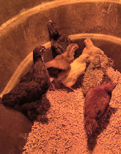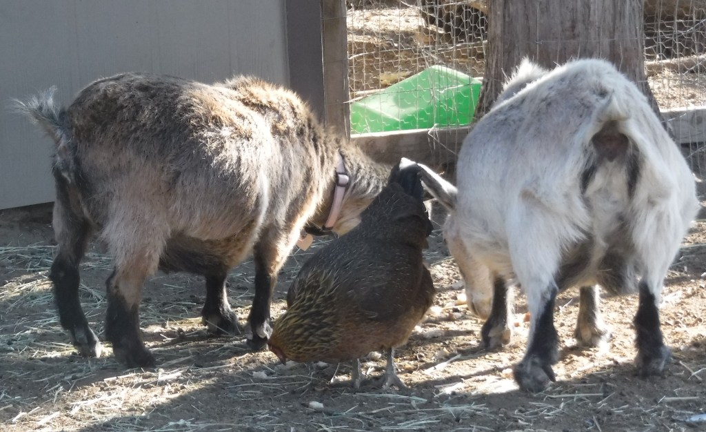 When it’s appropriate, I’ll roll their brooder to the outdoors chicken coop, where it’ll set allowing safe interacting with the adult hen (Welsummer) and twin dwarf goats. Once all are comfortable together, I’ll free the chicks.