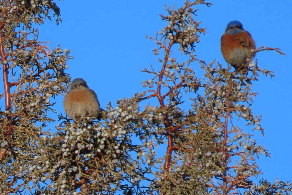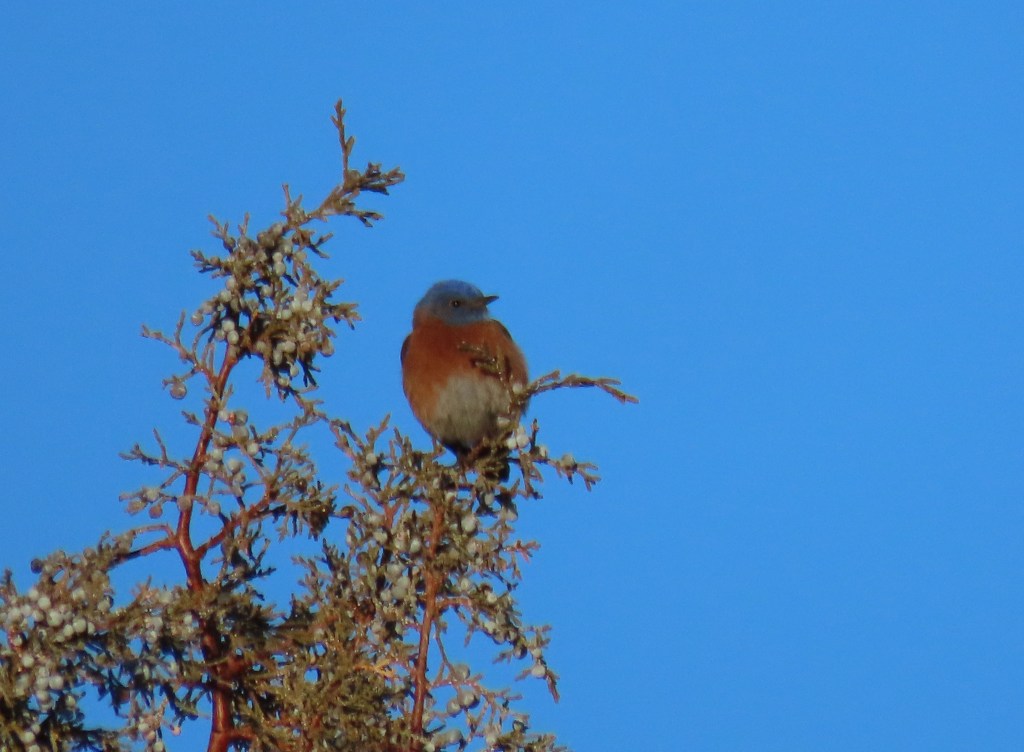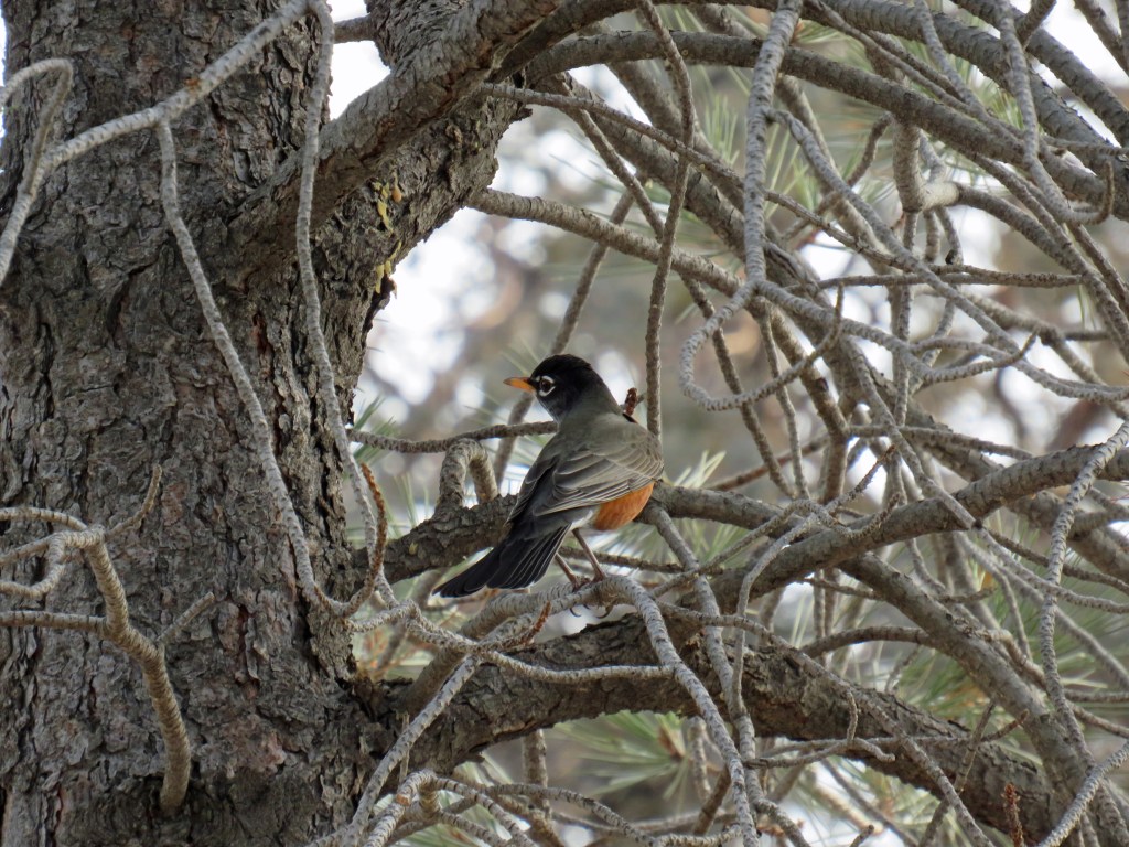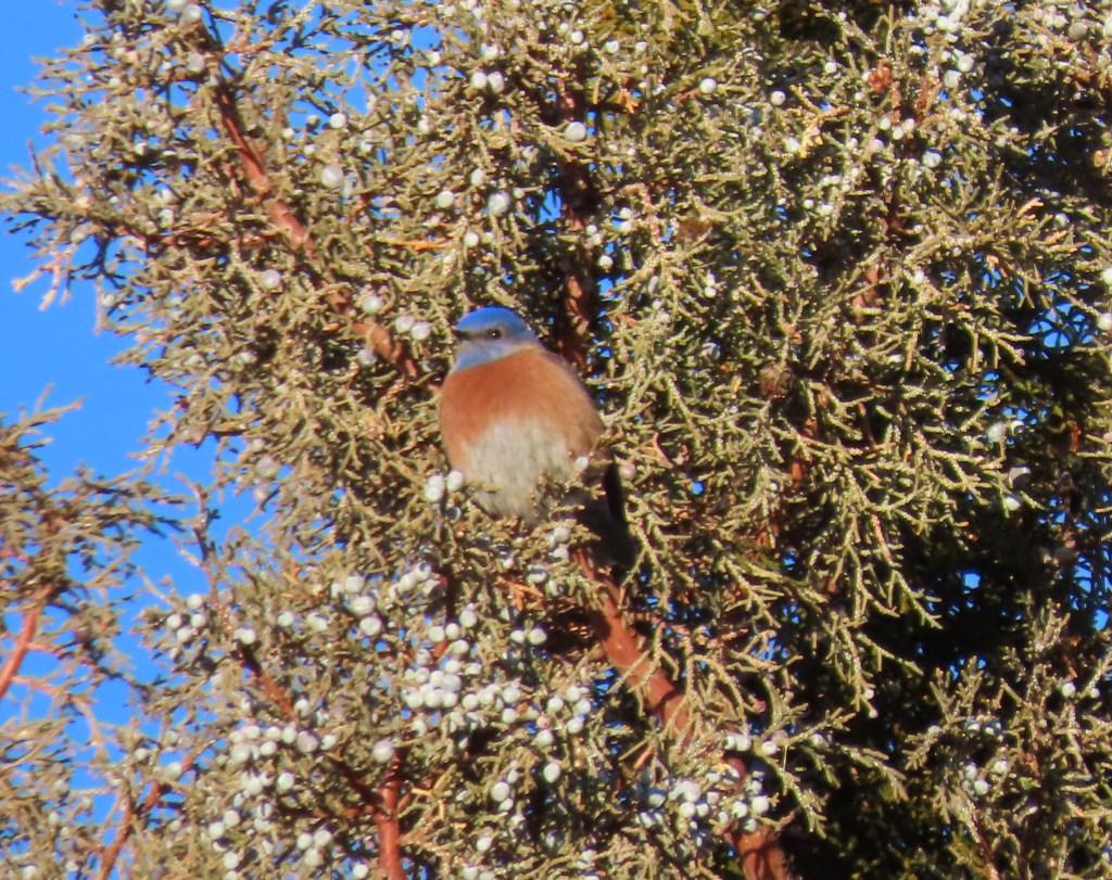 These days, pine trees aren’t where this Robin and its buddies mostly hang out. Instead, they’re flocking to junipers, loaded now with ripe berries, and happily becoming drunkards.