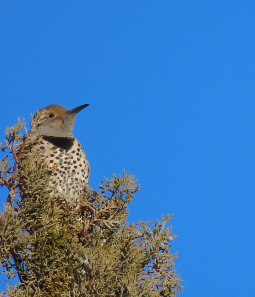 My new toys are up and running, after having received and installed various auxiliary parts. Today’s header photo is of a flicker high in a treetop. It’s from my 70sx zoom camera, with me about fifty yards away. The eye viewer helps to stabilize shots, yet there’s a little camera shake. I tried three times to capture the entire bird, finally successful in an instant before it flew.