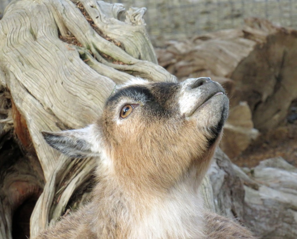 Dwarf goats are cute and irresistible. Here’s Poppy, in a goat trance, while happily rubbing her butt against a log.
