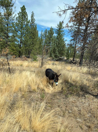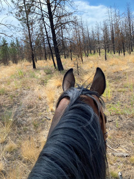 Yesterday, I rode Sunni and ponied Rosie into the forest. I’m still trying to connect two horse trails that recently I ran across. Both go in the same direction but they’re totally separate. Connecting them would create a loop, with one trail going from the trailhead and the other returning to it. This would create in a beautiful part of the forest about a four-mile riding loop, allowing one on horseback to avoid dusty roadways.