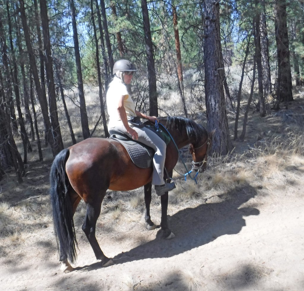Sunni is a kind horse and that bridle made just one noticeable difference–more “discussions” about whether she could stop and graze. I found that her neck is strong enough to ignore some of my tuggings, but she didn’t always win. Anyway, Sunni is good natured, willing to stop only briefly before moving ahead.