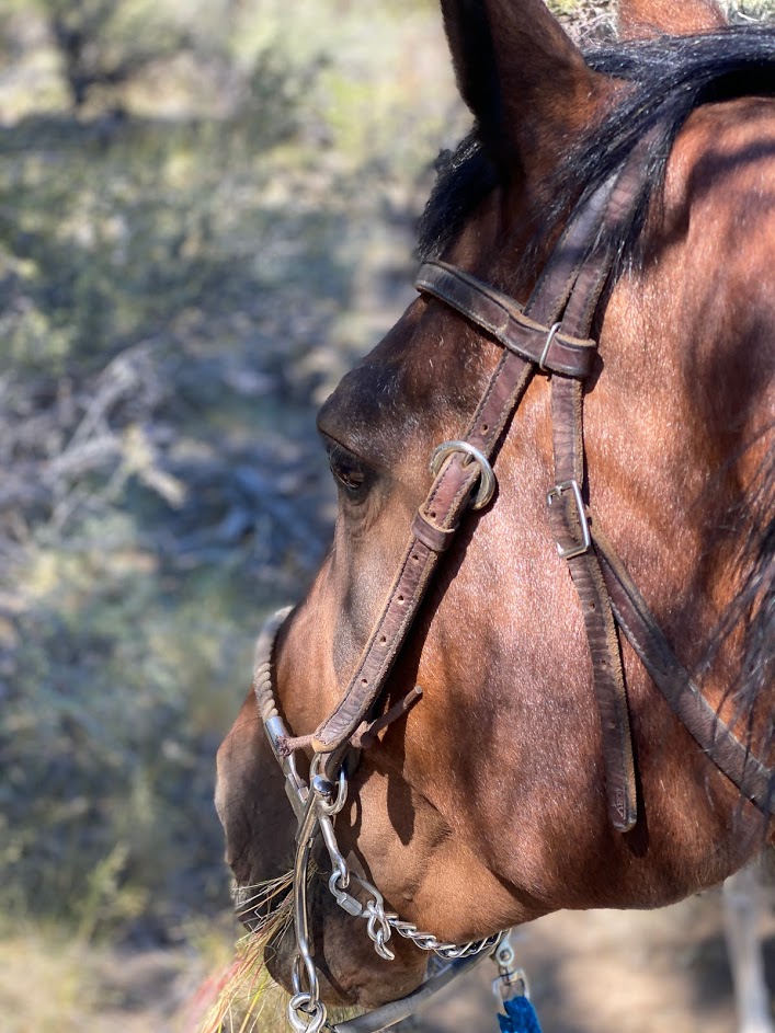 I rode Sunni and she for the first time wore a bitless bridle. For anyone unfamiliar with bitless bridles, they’re like having the horse in a simple halter. The difference is that a bitless bridle has rings to accommodate ordinary reins. For a horse, generally easygoing and cooperative, a bitless bridle is comfortable, allows for grazing, and is easy to put on and take off. It’s important to know, however, that if a horse decides to take off–I’m saying, really get going like BOOM–a rider can’t do much to stop that action.