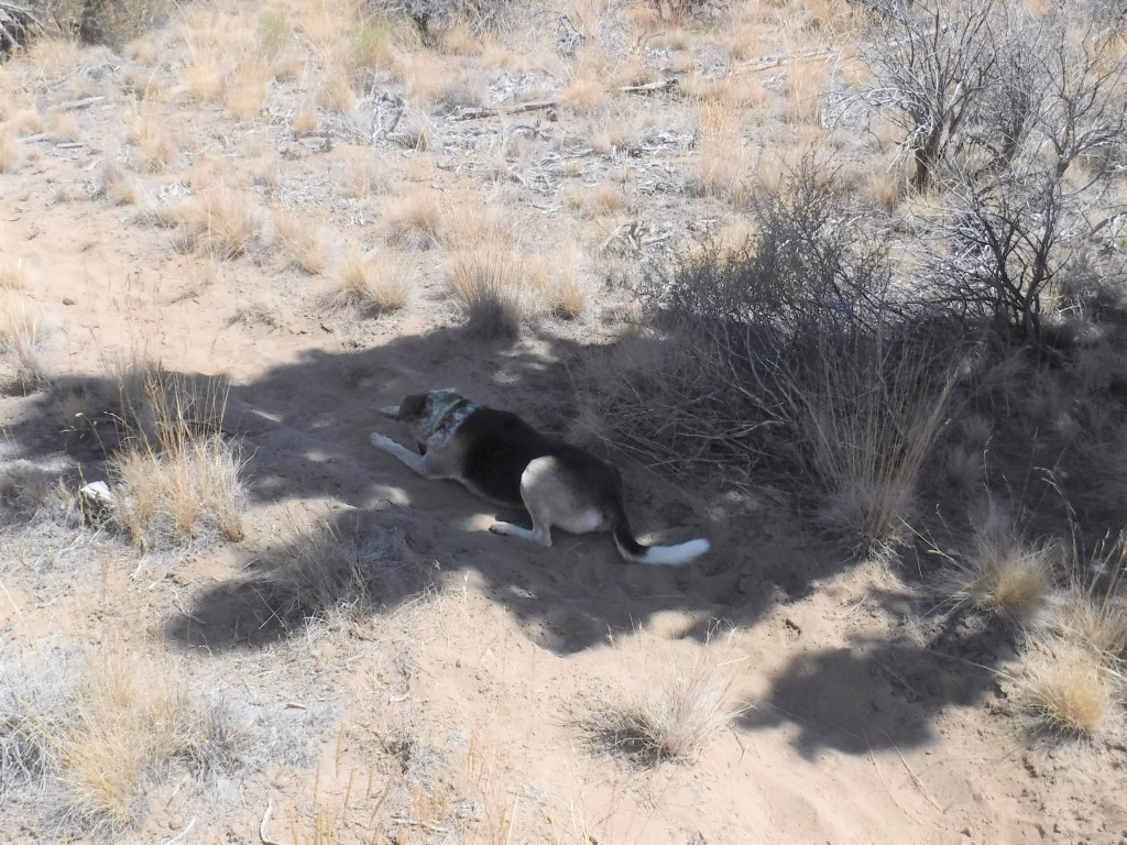 Sunni strolled and ate her way through the grasslands and among trees for about a mile. She exactly was on target. We emerged on a road where on a hill above stood an adobe house–a key marker that signals the nearby trailhead.