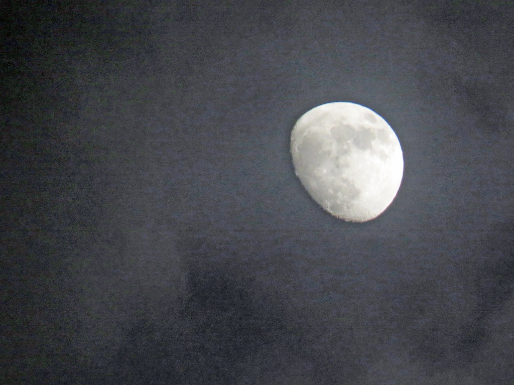 Last night, we had a 3/4 moon–a shape I love, roundish and soft-looking. Unfortunately, active clouds scuttling over the moon were causing periods of invisibility. When the moon did appear, fast-moving clouds threatened to obliterate it. I hurried into the house for a camera that could focus quickly and capture well. Today’s header photo is my first decent moon shot since last I used the zoom Canon.