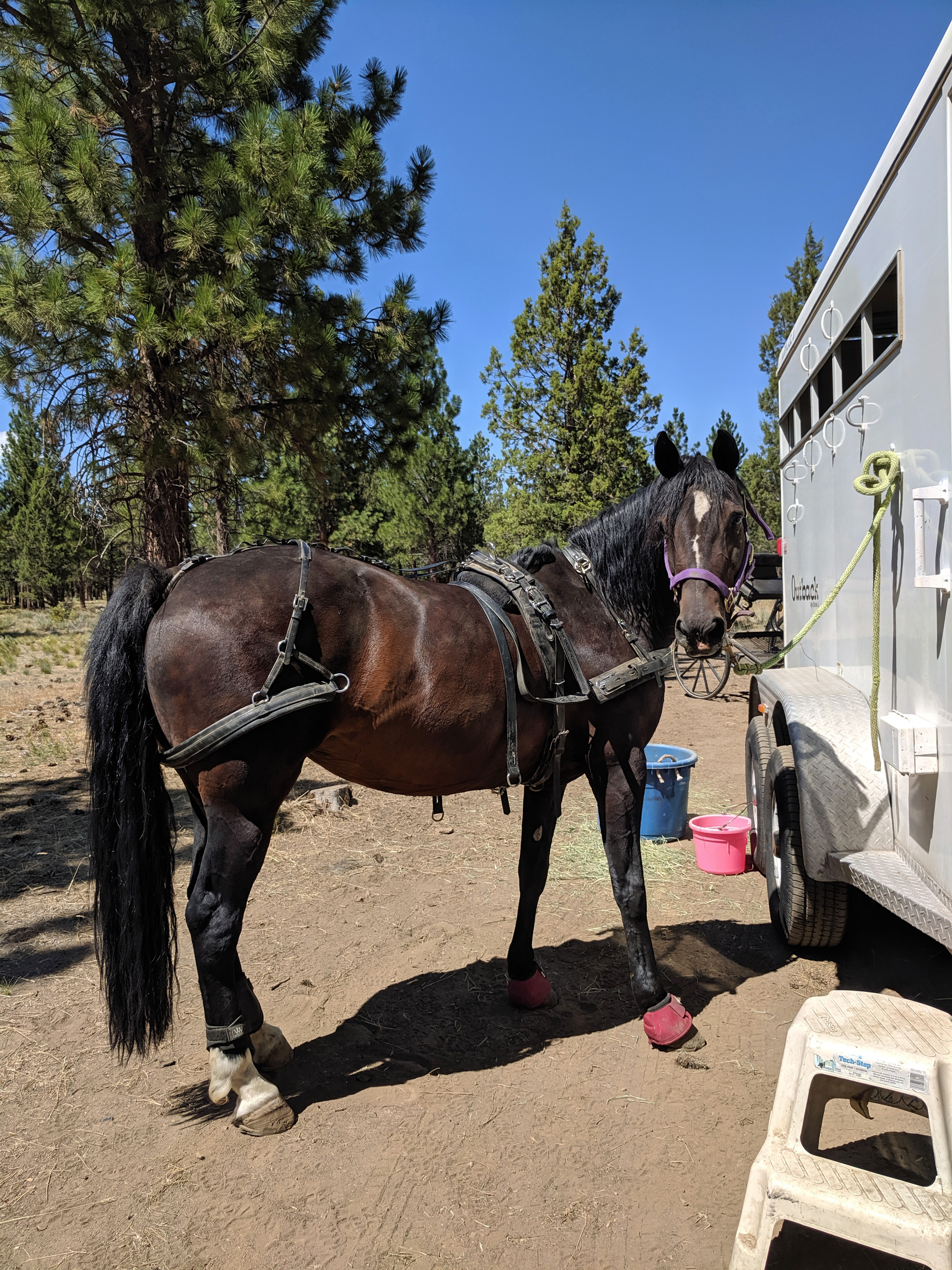 When we finally rolled into our trailhead, a couple of young women unsaddling their horses hailed us. They wanted to know how we had managed to haul a carriage. And they were riding Morgans, had more at home and love the breed. One woman is from AZ, hauled three Morgans here to visit her friend, who it happens lives on Bend’s east side and not far from me. (She knew my place, from having passed and and seeing my donkey, Pimmy, who’s always an eye-catcher.) These ladies helped to reload and secure my cart, and we exchanged phone numbers. Something that makes having horses really special is a shared affection for them that encourages and nourishes friendships.