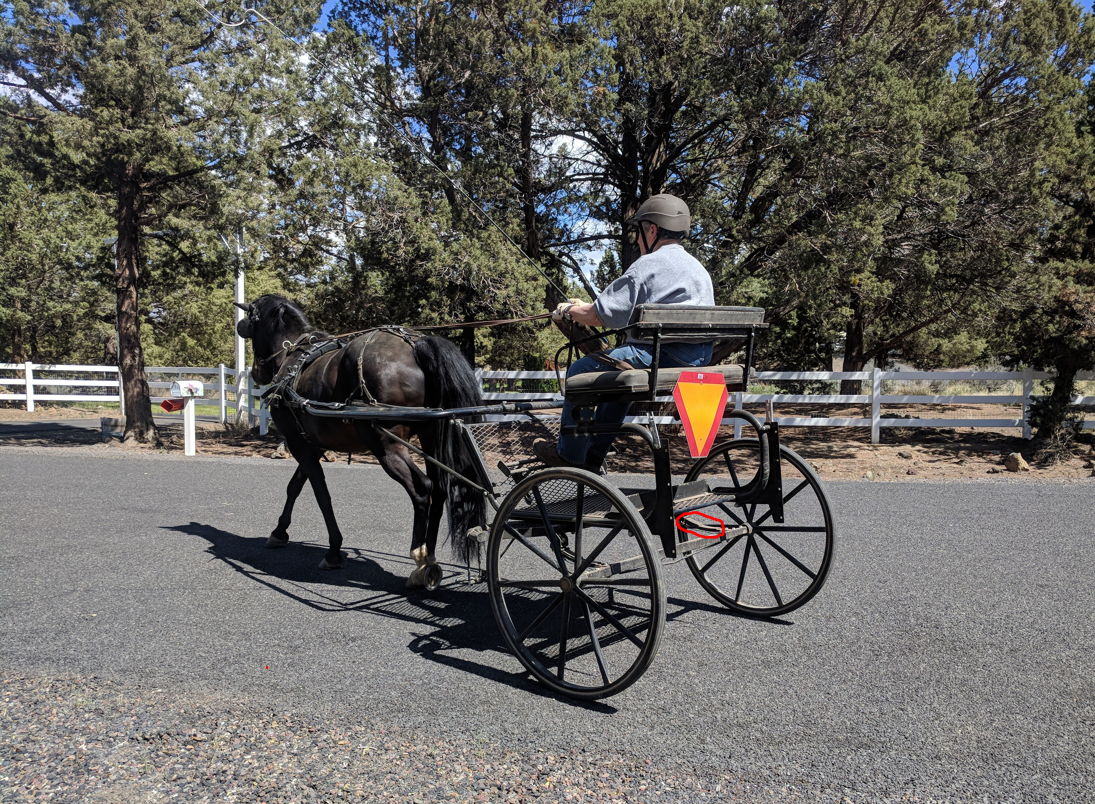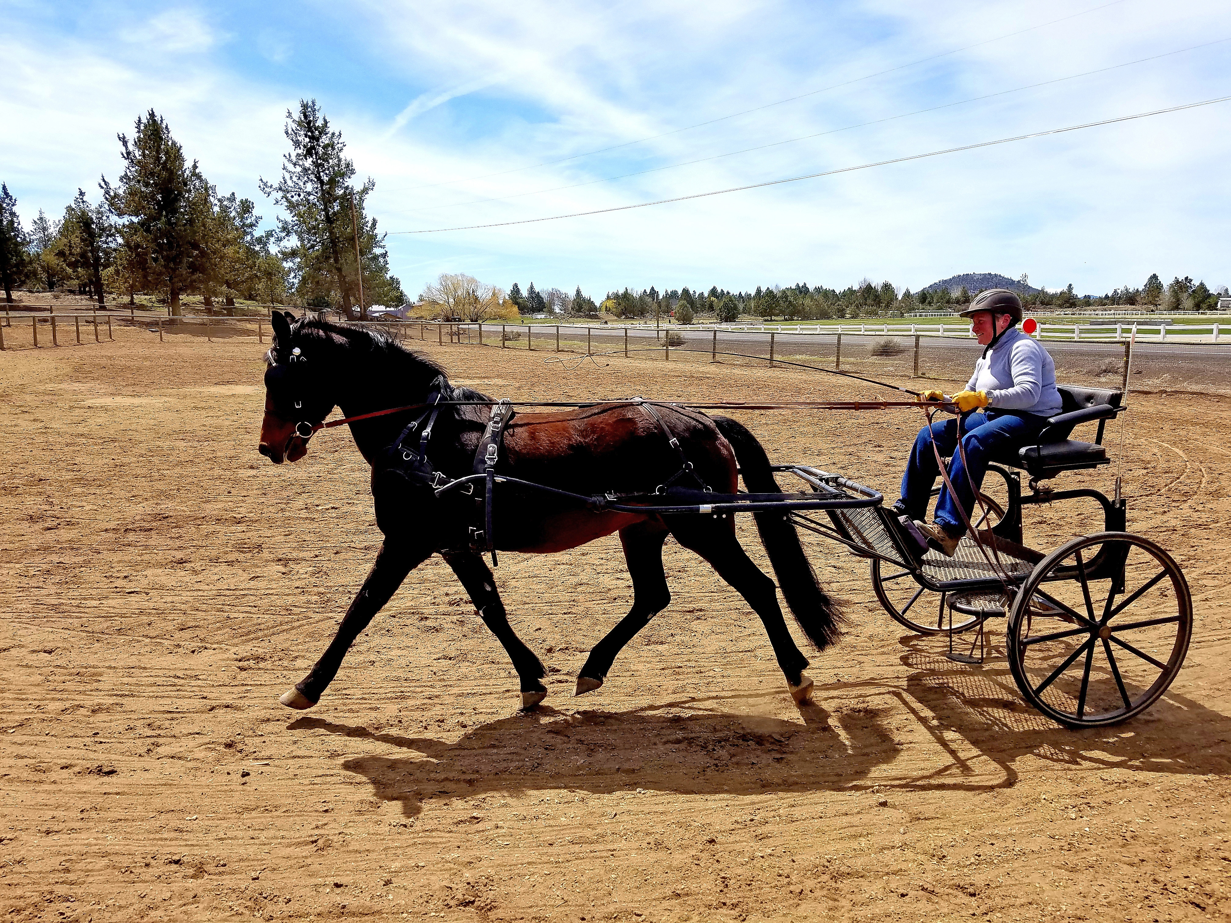 In a real competition, a driving team competes in dressage and also must complete a timed cones course. The dressage and cones arenas require drivers to wear fancy hats and scarfs–clothing representing formal driving attire, in the early 20th Century, when driving was the way to get around. Oh yes, and clean shoes (heels not required). Our driving trainer says not to worry for she has a collection of appropriate hats and clothing articles.