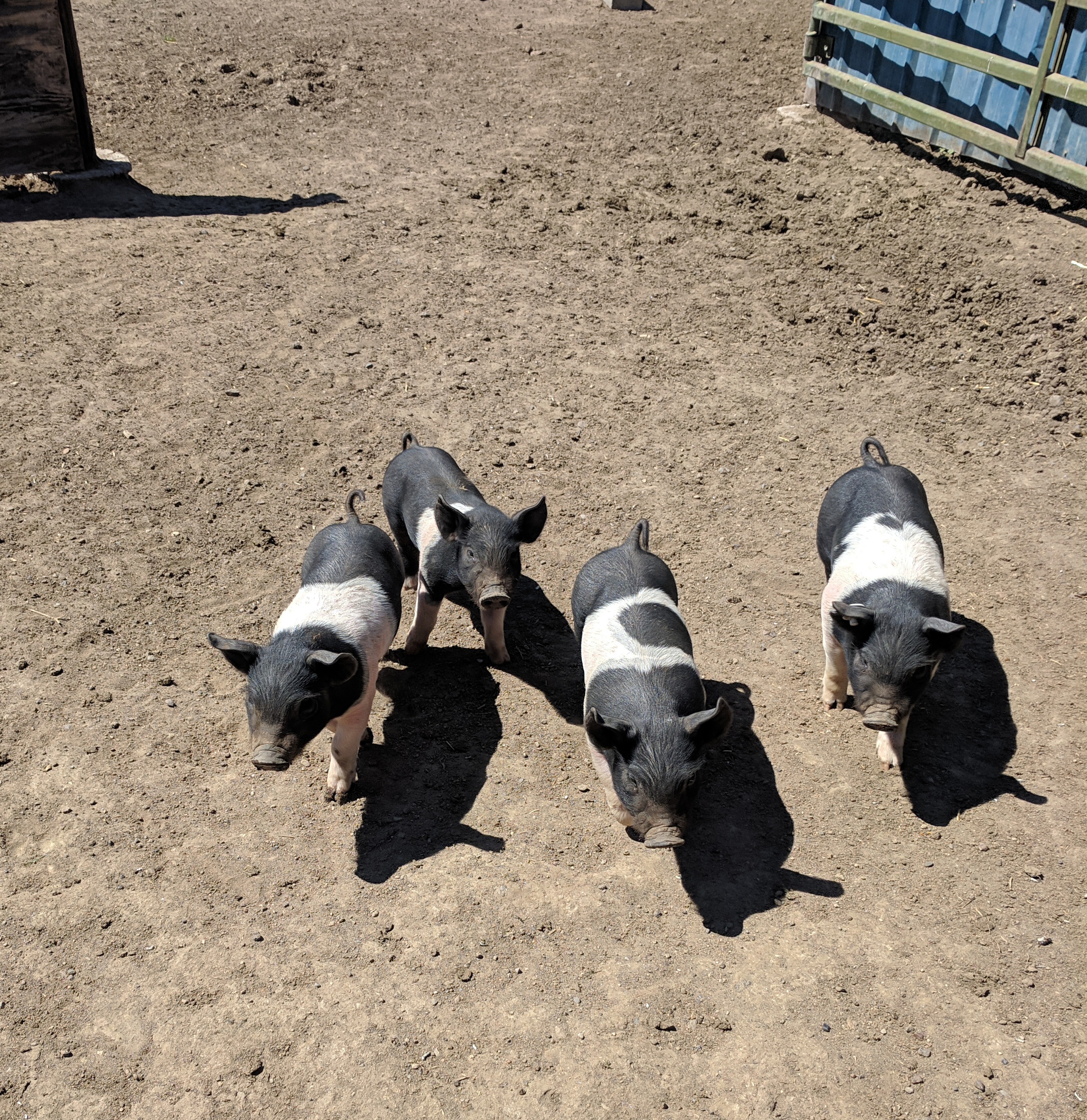 This week, I met the massive and beautiful Shasta along with her week-old babies. Shasta is a recent import from California, two years old and very special, for she’s a show pig. I’m a novice, to my eyes Shasta could have weighed 400 lbs. with her every inch lean and solid. She’s very friendly but pushy, and it was astonishing to find how easily she could have pushed me completely off my feet. Apparently, a pig’s low center of gravity gives it power. Standing low and compact, it has the strength of a mini-tractor.