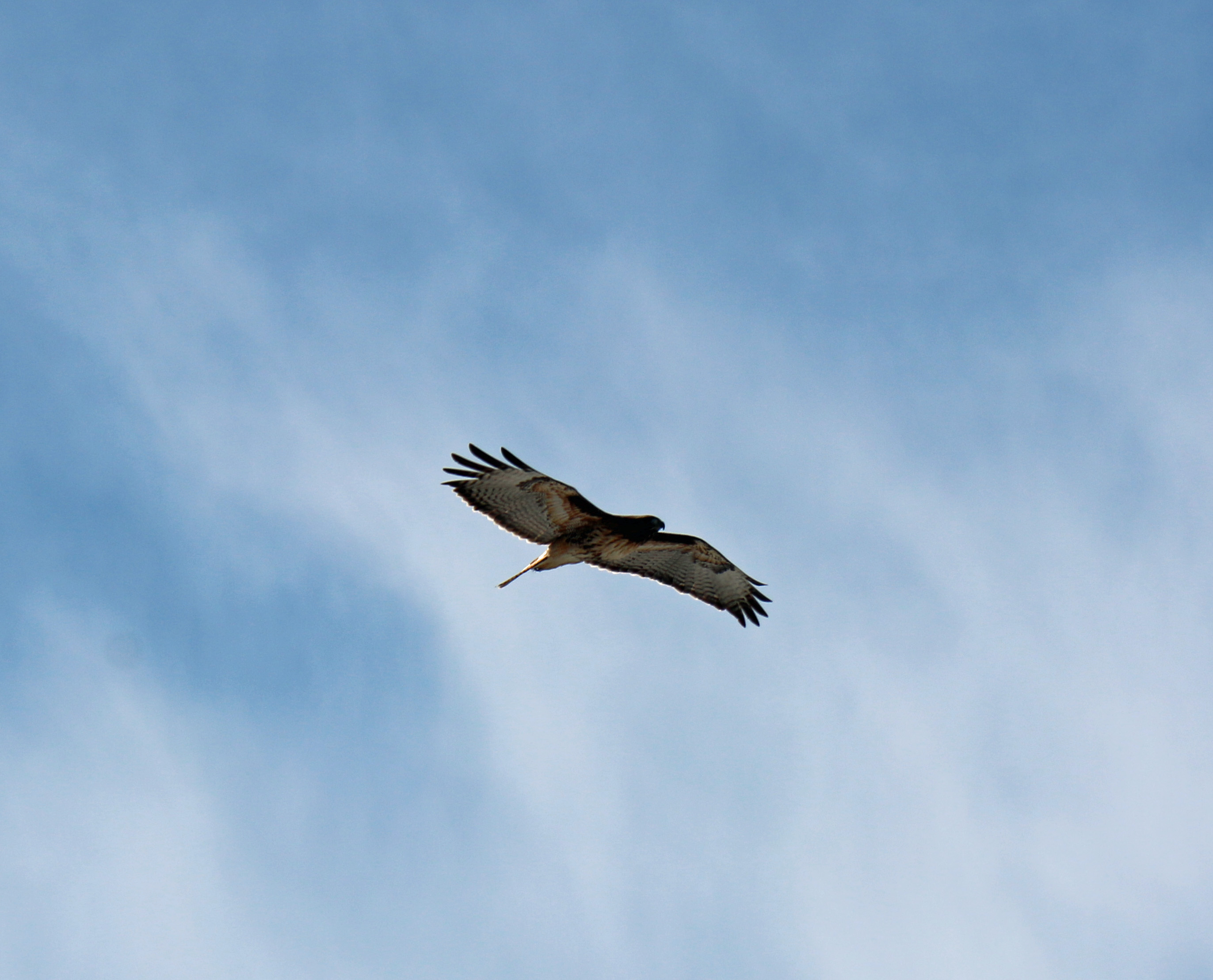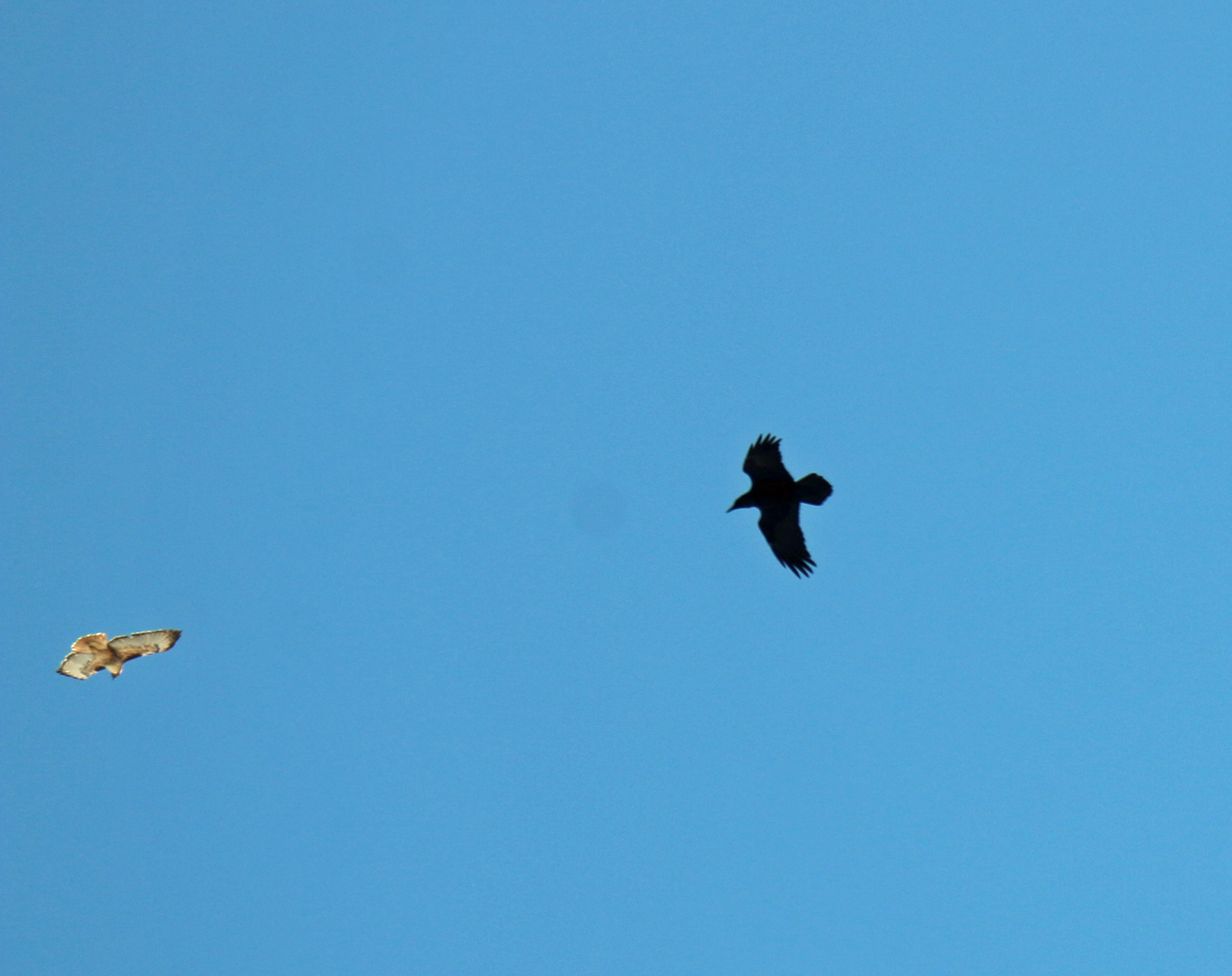 The moment that Red Tail’s mate entered my vision those high-pitched Raven’s screeches began making sense. Now, I saw that a single Raven was chasing two hawks that probably had approached its nest. I’ve seen similar aerial battles but never a single Raven chasing a pair of Red Tails. I’ve seen the opposite, single hawks chased by pairs of Ravens. I’ve learned that angry Ravens are relentless and will chase Red Tails to near exhaustion.