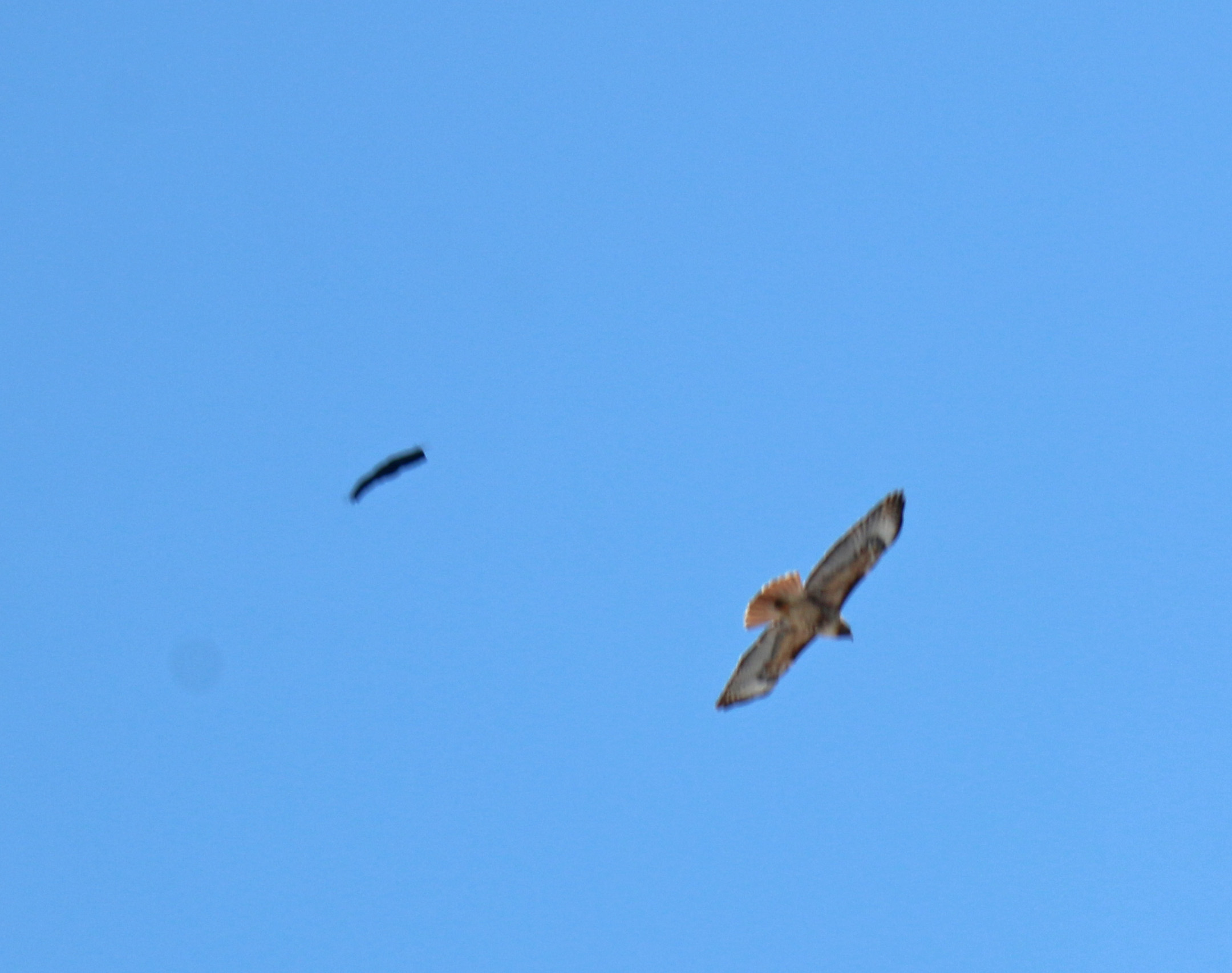 The hawks suddenly veered away in a very large circle, the Raven hotly pursuing, and all flew out of my sight. For awhile, I heard screeching, and when it stopped, figured the Raven had won.