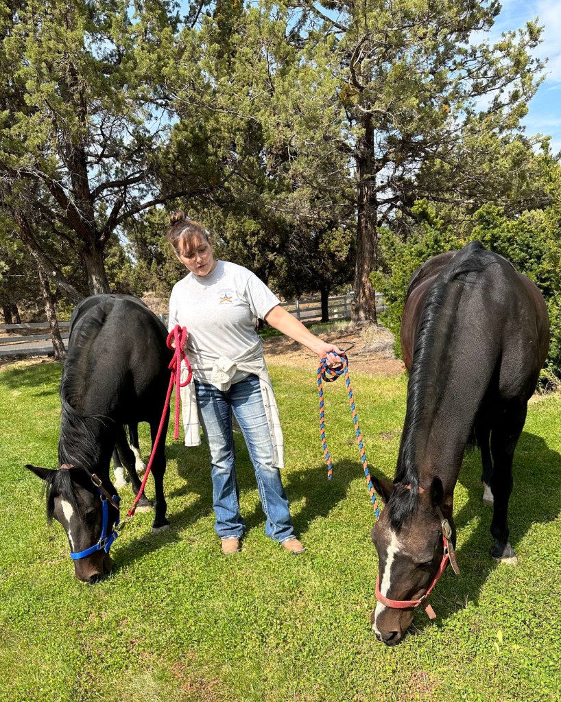 The header shows my co-worker and friend, Angie, holding my horses, Sunni and Rosie. After we took photos on my property, we drifted toward my neighbor’s pretty “golf course” lawn. The horses immediately went grass-crazy, and Angie held the lead ropes tightly.